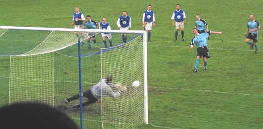 McColligan and Hartley were then left one on one as the Saints striker was clear on goal, both ended on the floor in the box with McColligan down first and Connolly next, not the first time Hartley had found the floor in and around the box and not the last, referee Martindale seemed happy to award a free kick every time Hartley went over and this time was no exception, penalty to Saints. Justice was done however as Colin Scott guessed correctly and dived to his right to push away the effort.