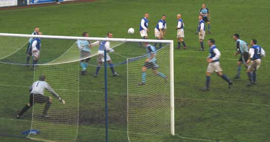 On the half-hour mark Queens almost opened the scoring as a low angled ball from the right into the box was swung onto by John O'Neill and the crowd behind the goal could only groan as the ball hit the foot of the post and rebounded away just past the despairing leg of Brian McLaughlin. The ball was not cleared however and it was soon back across the goal mouth where Eric Paton looked certain to score as he wrong footed the 'keeper to send the ball toward the bottom right hand corner, it was Cuthberts' day though as his flailing leg caught the ball and again kept it out of the net.