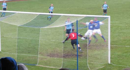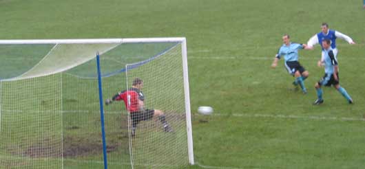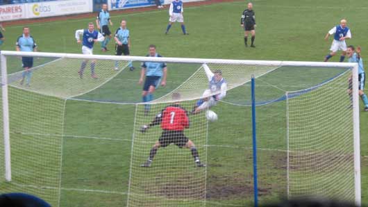 Sean O'Connor was next up to miss the net by a fraction as his effort must have skimmed a layer of paint off the post as it crashed into the net support at the back of the goals, Cuthbert this time was stranded at the other side of his goals.