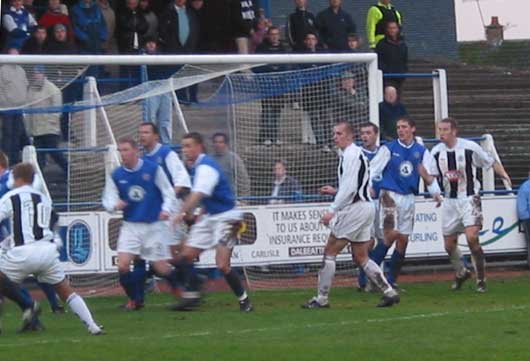 Next to their feet were the Paisley support in fifteen minutes as a cross from the right was won by Martin Cameron at the back post, his downward header looking to the Buddies fans, at least to have gone into the back of the net but having actually gone the wrong side of the post for them.