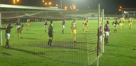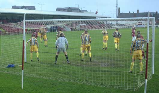 In the 52nd minute, John Cusick picked up the first booking of the game for a retaliatory kick at Weatherson. Three minutes later, following a right sided Arbroath corner, Paul Browne looped a header goalward and Derek Lyle turned saviour this time, heading it off the line at the right post. Within a minute though Cusick picked up a second booking for talking back to the referee in the middle of the park and was duly sent off. In the 57th minute Sean O'Connor worked himself an opening and shot from ten yards but Hinchcliffe was able to block and the ball spun back against Sean and out for a goal kick. A couple of minutes later though Henslee's right sided cross was almost carried straight into the goal by the breeze but just eluded the back post with Goram beaten. In the 62nd minute though the "Lichties" did find a toe hold back into the game. A corner from the left side was headed powerfully downwards and towards goal from the edge of the penalty area and Murray McDowall (who spent two games on loan at Palmerston last season) reacted quickest to sweep the loose ball into the roof of the net from about three yards out.