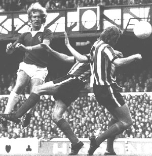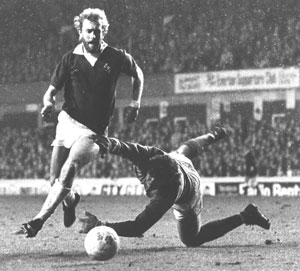 John Connolly rounds the Birmingham City 'keeper before netting. | Born and raised in Barrhead, near Paisley, John played for Glasgow United as a youngster and one of his team mates at that time was none other than the legendary Kenny Dalglish. "I often tell the story" he reflects "That the two strikers in the side were Dalglish and Connolly. Kenny went on to become a 'superstar' and make his fortune while I'm still working away--there's the difference between the two of us. However I never thought I'd be playing alongside him again six years later for Scotland". |