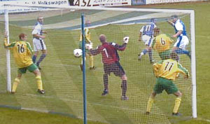 | On the eve of the season another piece of the jigsaw was put in place when Gordon Connelly signed from Carlisle United and he went straight into the squad for the first competitive match. In fact it was the first competitive match ever at Hamilton's new Ballast Stadium and the division's best crowd of the whole season (3,192), barring the final week, was there to see it. Unfortunately, that didn't include me as a friend's wedding in Perth kept me from attending. However, by all accounts Queens were very fortunate to come away with a point earned in a 1-1 draw. Peter Weatherson headed us into a first half lead past "Trialist" goalkeeper Andy Goram but an error from Campbell in goal led to a second half equaliser from Gaughan. |