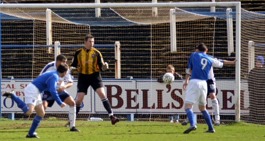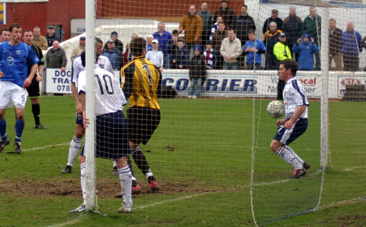 Queens almost started with an immediate goal as Graham Weir met an Eric Paton cross from the right, low at the foot of the post but the giant McCaldon in the visitors goal pushed it around the post for a corner to Queens. The resulting corner gave Stuart Lovell a goalden chance but the 'Courier Player of the Month' couldn't quite steer his header onto the target much to the relief of the visiting defence. |