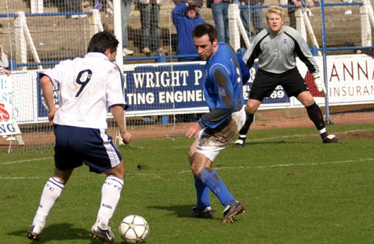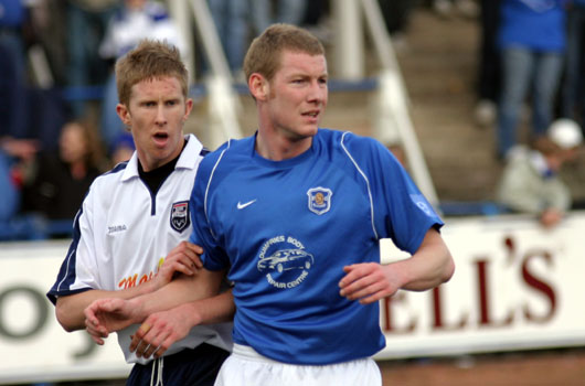 After half time Willie Gibson had more of an impact, early in the half he tried on two occasions to turn inside and shoot for goal.. His first effort was easily collected, although had it spilled Andy Thomson was ready to pounce and his second effort gave the keeper a bit more trouble but the big man got down well to push the ball around the post. The Staggies defenders were having a tough time with Gibson and soon conceded a free kick, Paton stepped up again but this time his effort curled past the far post. County were giving as good as they got and a snapshot by Don Cowie from the edge of the box was well taken by Richie Barnard. Moments later it was McCaldon's turn to produce a good stop as he blocked a Willie Gibson free kick that was taken low and hard. At the other end John Rankin fired an effort past the post from a Sean Higgins knock-down much to the relief of the old stand side fans who were waiting for the net to bulge. The biggest cheer of the day came fifteen minutes into the half when Sean O'Connor made his long awaited return to Palmerston by replacing legend Andy Thomson. Shortly after Gary Wood took over from Derek Lyle and then finally Graham Weir for Michael Mullen. |
