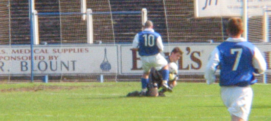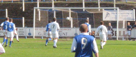 Fifteen minutes into the half and the game sprang to life with a superb Eric Paton strike that, had it gone in, would surely have been goal of the season. Paton struck a superb shot past the helpless Cuthbert only to see it crash off the post and rebound to safety, from here the ball was played upfield and as Parker and Reid tangled the stability of Parker was again brought into question as the little fellow crumpled to the ground inside the box! Naturally a penalty was awarded and duly converted by Simon Donnelly to give the Perth Saints an undeserved lead. This rocked Queens and the lead could have doubled minutes later as Parker rounded Samson and shot toward goal only to see Jim Thomson making the blocking interception. |