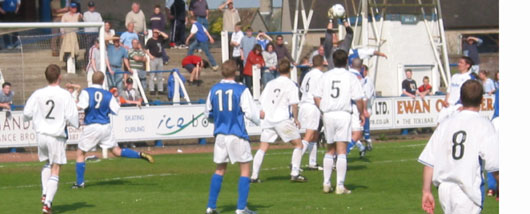 The game itself got off to a quiet start and it wasn't until almost a quarter of an hour had passed until there was any real action to note as a long clearance from Craig Samson was headed on by Alex Burke to Emilio Jaconelli whose goal bound shot was well blocked by Stephen Fraser. Queens were doing all the pressing at this stage with Gibson and Paton the play makers. Alex Burke seems to be getting even better with every match he plays, or maybe people are realising just how much he will be missed and how much he contributes. He demonstrated his skills in the twenty-second minute as he turned and shot at goal only to see his effort deflected past for a corner with Cuthbert well beaten. A brief foray forward for Saints followed without them creating any real concern for the home side. A combination of Burke, Bowey and Jaconelli on the half-hour mark ended in a miss-hit Bowser shot trundling past, then a few minutes later a corner at the other end was fumbled by Craig Samson but fortunately Paul Bernard shot well over the bar. Three minutes later and the Perth Saints should have taken the lead as Stuart Taylor was the recipient of a flick on in the box that saw him faced with just Craig Samson in the Queens goal, the number eleven could not compose himself enough and blasted the ball against the bar and away to safety. Queens were still producing chances although it didn't look like we were going to score too many. Emilio was having another 'bad luck' half and this was typified just five minutes before the end of the half as Cuthbert managed to get to a Burke through ball just before Emilio and then dropped the ball before the striker could nip it back off him. The last action of the half saw Craig Samson save us as he leapt to his left to made a spectacular one handed save to deny Taylor. |