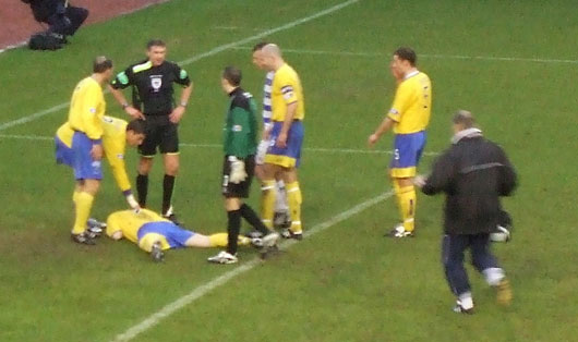 ![]() Sean receives treatment for a head knock whilst defending - from David Gow on the terracing |