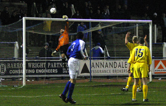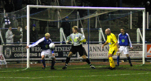 In place of Lyle was Emilio Jaconelli making a rare start and he was to be the lone striker in a side with a five man midfield featuring Burns, Paton, Lovell, Bowey and McLaughlin, whilst the defence was as per the last outing. Queens started well and chased down Clyde at every opportunity, with just a few minutes on the clock Jim Thomson could have opened the scoring as he had a free header from a corner but could only send it over the bar. Clyde were happy to play on the break and almost caught out Queens on the quarter hour as the ball was lobbed over the defence for Alex Burns to run on to, the midfielder set up Ian Harty in the six yard box and with a free shot on goal available to Harty his effort was superbly pushed away as Richie Barnard pushed the ball over the bar from point blank range. Queens continued to play the better football and to dominate the possession, hardly surprising with the five man midfield and with the influential Darren Sheridan missing for Clyde, however with only Jaconelli upfront there was little chance of Queens constructing a decent move in the final third of the park. At the other end the deadlock was broken as a Clyde corner was headed toward the back post from John Potter on the penalty spot, Steve Bowey was on the post and looked to clear but could only push the ball out as far as Gary Bollan who lashed it home to open the scoring. 1-0 to the Bully Wee and you knew then that it was likely to stay that way! |