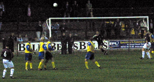 McKenzie fires his free-kick wide of the post as the wall watch