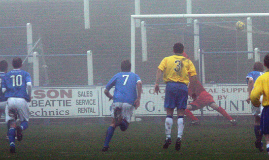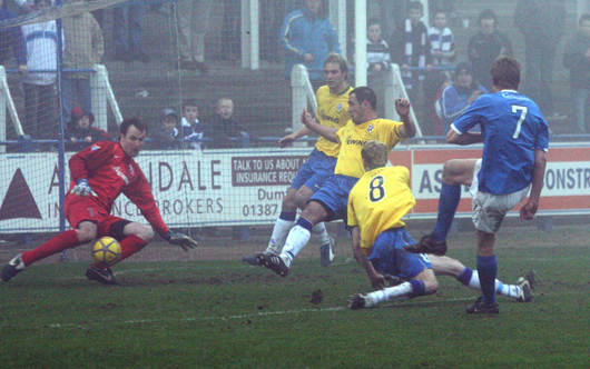 Despite a heavy night of frost the new pitch covers again proved their worth as did the efforts of the Queens fans who volunteered to take the covers off this morning, the pitch was perfect and the only problem was a bit of fog that at times obscured any decent view of the Terregles Street end. It was the 'Blue Brazil' that started the stronger of the two sides as Queens looked a bit heavy footed. An early Cowden corner was almost forced in and their energetic play, particularly down their right hand side was causing the Queens defence a fair bit of trouble. With twenty five minutes gone a Cowdenbeath corner was forced over the bar by MacDonald in the Queens goal and then scrambled clear by Jim Thomson from their second effort. Queens then suddenly found some inspiration as the superb Jamie Adams surged into the box, as he strode forward he was impeded by a Cowden defender and referee Clark had no doubt as he awarded the penalty kick. Stephen Dobbie is the man to take the kicks at the moment and his effort high into the roof of the net gave David Hay in the visitors goal no chance. |