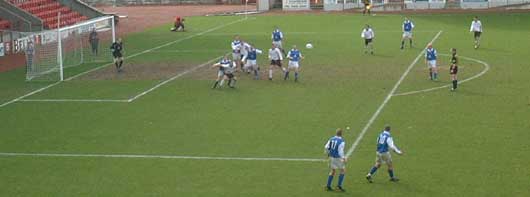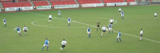Queens started well and after only two minutes, Jaconelli bustled his way past Mensing and struck at goal from 18 yards though it proved an easy save for Halliwell. On the ten minute mark, a Paton ball forward was chested back by O'Connor to Bowey who hit from 25 yards but Halliwell again saved above his head easily enough. Straight up the other end and Ian Harty was late in a challenge on Aitken in midfield, causing a reaction from Andy. There is history between these two going back to Harty's Stranraer days so it was no surprise when Harty sprang to his feet to square up to his opponent. Referee Kenny Clark was quick to separate them before any blows were exchanged though and both players were booked for their troubles. |