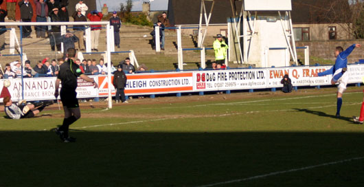 ![]() Imrie is grounded as his super strike heads for the back of the net |