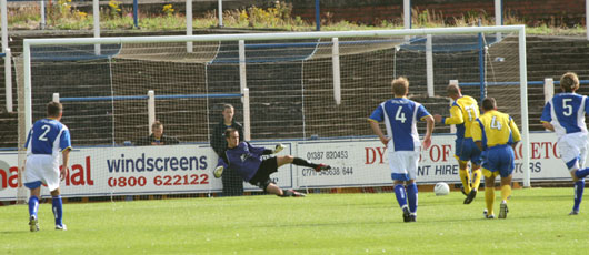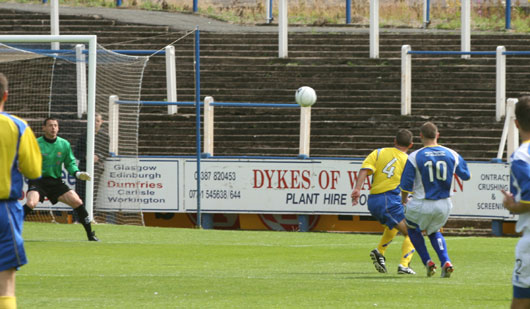 Then on 27 minutes Neil MacFarlane pulled out a trick from the top drawer as he collected what looked like a harmless ball about thirty five yards out before looking up and then placing a dipping effort over the head of Alan Main and into the back of the net for a spectacular second goal. |