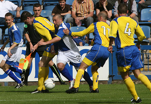 The game was raging from end to end and with a slight lack of height in the centre of the home defence Kevin James appeared to believe that he had the run of the box at every corner or free kick. The big man didn't have any success today though as both Liam Atkin and Andy Aitken proved stern opposition for him. The other 'main' threat from St Johnstone - Martin Hardie was also being given special attention today as Neil MacFarlane shepherded him in the opening stages.