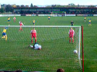 On 24 minutes, Greg Millar flashed a dangerous cross across the penalty area which both Thomson and Reid threw themselves at without making any contact. Fortunately neither did any home player! Ten minutes later Paul Burns had a half-volley from a Talbot corner blocked by David White and Brechin broke forward quickly. Charlie King drew a defender before slipping Neil Jablonski clear on goal 40 yards out. He ran to the edge of the penalty area, closed down by Jim Thomson, before shooting. His effort took a wicked deflection off Thomson's leg, leaving Colin Scott completely wrong-footed, but missing the foot of the right post by a matter of inches.