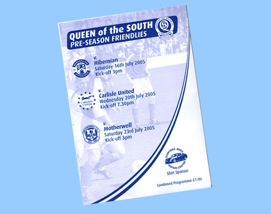 The three friendly matches coming up at Palmerston versus Hibs, Carlisle and Motherwell will all have the same programme. The special issue will cost £1.00 and can be purchased direct form the club mail order for £1.50. It has twenty pages - five per team and is an advertisement free zone.