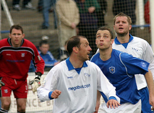 Saturday 15th April proved to be the crucial day when the gap was wrenched out to more than one game. Stranraer surrendered meekly at Airdrie to a 3-0 defeat whilst Queens produced the result of the day to best St Johnstone by 3-2. The Perth side had not lost a game previously in 2006 and the victory handed the title to St Mirren (although they did beat Dundee a few minutes later to underline it). Queens raced off to a superb start with goals from O'Neill (a penalty controversially awarded by the assistant referee after the man in the middle failed to spot it) and Weir again, whilst the visitors had Martin Hardie sent off for a kick at Gary Wood. Despite their shortage of numbers though the Saintees recovered with goals from Kevin James and Paul Sheerin hauling them level before the break. It was a tight second half but with 15 minutes left Kevin James spectacularly looped a header over his own keeper to hand us the vital points. |