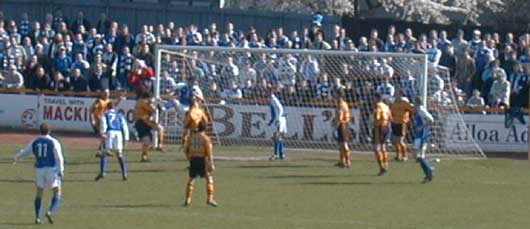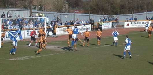 However, after this bright start, Alloa began to dominate and it was no great surprise when they took the lead after quarter of an hour. Richard Walker was the man causing all the damage, running up the right he evaded the attention of McAlpine and Anderson before rounding Aitken to reach the goal-line. His low and hard cross was partly intercepted by Colin Scott but the keeper only succeeded in deflecting the ball towards his own goal. The ball may have been going in anyway but Gareth Hutchison appeared to make sure, knocking in from practically on the line.