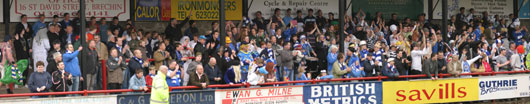 It wasn't a classic by any means but a brilliant headed goal by Sean O'Connor midway through the first half put us ahead and sent the 400+ fans, many of them in fancy dress into raptures. Brechin did snatch an equaliser late in the game and that put us under a bit of pressure but when news filtered through that St Mirren had beaten Stranraer the fans started all over again, celebrating long after the final whistle. Naturally Ian McCall was a happy man and again paid tribute to the supporters. Said the manager, "They've been superb all along and today I was creased with laughter at some of the fancy dress - particularly those in Steve Bowey masks. It wasn't pretty to watch but the park left a lot to be desired. We were in control in the early stages but they came back at us in the second half and all in all a draw was perhaps a fair result and it was a tremendous free kick from Stuart Callaghan that earned them it. "It was great to see Sean O'Connor get on the scoresheet - it was a super header and a great ball in from Ryan McStay. Sean took a real bang on the knee but played on and I was glad to see that - he can be a real handful for any defence". Asked if he ever felt we were destined for relegation when 12 points behind he admitted, "At times I had my doubts but when the new players came in January it lifted the spirits of those already here and after that they just gelled. And that was a great sense of relief for me. It was a great achievement and up there with helping Airdrieonians stay in the first division back in 2002. If that hadn't happened there would be no Airdrie United today. But a lot of credit must go to the players, our fans and the board of directors for without them it couldn't have happened. The first thing I did when I got back on the team coach was phone my Mum in Dumfries who was 'high as a kite'". Sean O'Connor dedicated his goal to physio Kenny Crichton, "Without all of the help I've had from Kenny I wouldn't have been fit to play today, it was great to score again for Queens and at such a crucial time. My thanks must also go to all the Queens fans who have stood by me and also to my girlfriend Sarah for all her backing through the bad times". Bill Goldie |