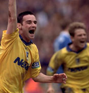 1994--In May of that year was transferred to Southend for a club record fee of £250,000. Andy was then transferred to Oxford United, then to Gillingham and to Queens Park Rangers before returning north of the border to sign for Partick Thistle. Joined Falkirk in June 2004. ![]() Scoring at Wembley |