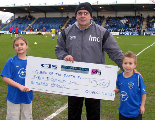 Two Youth Trust members, Joanna and Connor Gibson presented a cheque for three thousand two hundred pounds to Ian McCall prior to the match today. The total is made up of share purchases for the Queens Trust, Sponsorshipo by the Trust of Andy Thomson and Michael Mullen and the proceeds of the bucket collection recently at Palmerston.
