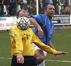 He's really been in the wars of late as only a week earlier Jim suffered a broken nose and a burst lip courtesy of Stranraer's Michael Moore. "Big Michael doesn't take prisoners" said Jim "And every time we come up against each other, the aerial tussles are a real battle. But football's a man's game so you've got to take the 'rough with the smooth'. ![]() Watching for those elbows |