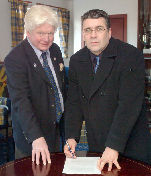 Ian McCall signs on the dotted line for a new two year extension to his existing contract with chairman, David Rae, keeping a close eye on proceedings. The signing is quite a 'feather in the cap' for Queen of the South since, just over a year ago, Ian was the third highest-paid manager in Scottish football at Dundee United, and only recently he turned down the opportunity to apply for the vacant manager's post at Premier League Caley Thistle to continue his work at Palmerston.