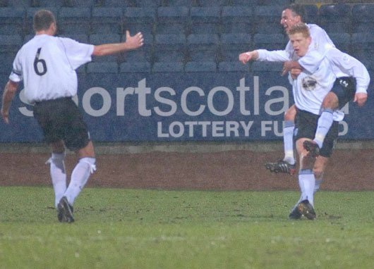 Said manager Ian McCall afterwards, "The fans were again immense and helped us towards an important win. It wasn't a great match to watch but the wind had a lot to do with that. It was a game of two halves - they were on top in the first half yet they never really managed to cut us open. We knew they'd rely on the 'long ball' for their big men but we defended well. The nearest they came to scoring was a Stephen Payne effort which came off the cross bar, that was a bit of a let off. However we came out fighting in the second period and totally dominated from then on. We had a 'stonewall' penalty turned down and Bowser missed a 'sitter', but minutes later he made amends from close range. We never really looked like losing after that but I was still glad to hear the final whistle. "But afterwards it was like Emergency Ward 10 in our dressing room, Jim Thomson has a broken nose and a burst lip, wee Burnsy also has a broken nose and Stuart Lovell a split eyebrow." Steve Bowey was also a happy man when he emerged from the dressing room. Said Bowser, "It's one of the best feeling sin the world to walk off Palmerston with a victory and particularly today when it was such an important match. To get the sponsors Man of the Match award was an added bonus, but to be fair, any one of our players could have won it this afternoon. We didn't play well in the first half but came out at the interval with 'guns blazing' and put them under a lot of pressure. I managed to stab home the only goal but I had missed an easier chance minutes earlier but couldn't quite get my head to it. That's us up into eighth spot now and that's where I hope we'll stay till the end of the season." Bill Goldie |