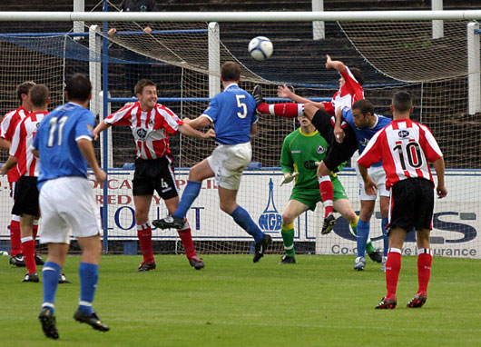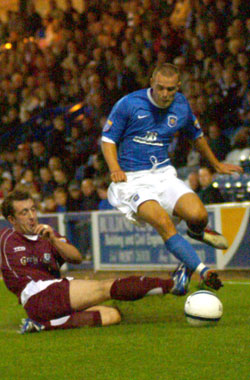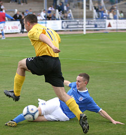 No such luck in the league campaign though as the first home game yielded a 1-0 defeat to St Johnstone courtesy of Simon Mensing's early headed goal. We never really looked much like getting an equaliser and all hope evaporated once Jim Lauchlan was sent off late on for hauling back Steven Milne. The first round of the Challenge Cup brought neighbours Stranraer through to Dumfries for a quickfire return to Palmerston. If truth be told it was a mundane performance all round though we were never in any danger of not winning really and duly did so with a John O'Neill penalty, awarded for a foul on Graham Weir. ![]() Paul Burns cuts out Stranraer's Paul McMullan |