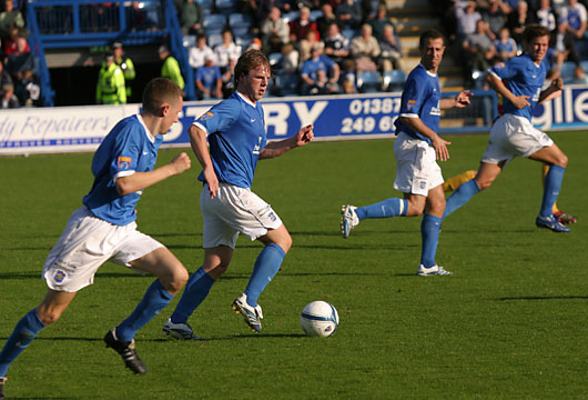 The quiet spell was also used to announce a new youth development initiative based around Queens home matches and local schools visits. Jim Thomson was appointed as the club's first Schools Liaison Officer in addition to his playing duties and revelled in the role. On the pitch though our luck was way out when Partick Thistle came visiting to complete the first quarter of the fixture list. Despite dominating the opening half we failed to score and were punished by two wonderful goals against the run of play from the visitors. The first came from Mark Roberts and was a fine finish, the second was by Simon Donnelly on the end of a fine passing move. The match did at least see some bright news as both Eric Paton and Graham Weir, wearing a mask to protect his cheekbone, made their returns from injury. Airdrie's win at home to Clyde though meant we fell five points adrift at the foot of the table. ![]() Plenty of effort against Thistle with 'masked man' Weir leading this charge. |