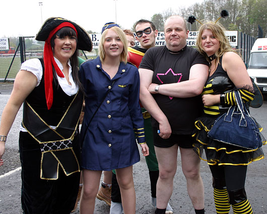 Before the trip to Perth Ian McCall was named SFL First Division Manager of the Month for March and Jamie MacDonald picked up the SFL Young Player of the Month too. Such awards are usually bad omens and so it proved again. We made a bright start at McDiarmid and should have been a couple up early but young MacDonald fumbled a corner late in the opening half and Andy Lawrie nodded the home side in front. The second half was marked by a 19 man confrontation sparked off by Jason Scotland's kick out at Jamie Adams and which saw several punches being thrown. Incredibly though referee Brian Winter saw fit to dish out only five yellow cards in the incident and no reds which was a massive let off for Scotland in particular. St Johnstone took full advantage by going on to clinch a 3-0 victory with a Simon Mensing header and a third from Willie McLaren. The last 20 minutes for both sides was all about waiting to hear results elsewhere though and when they eventually arrived it was celebration time regardless for the Doonhamer hordes in their fancy dress. The 12 game unbeaten run may have gone up in smoke but Airdrie and County both only managing to draw their games meant we were safe with a fixture to spare. Four points clear of both sides, the "Great Escape Mark 2" had been achieved. ![]() Brilliant fancy dress as always |