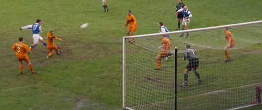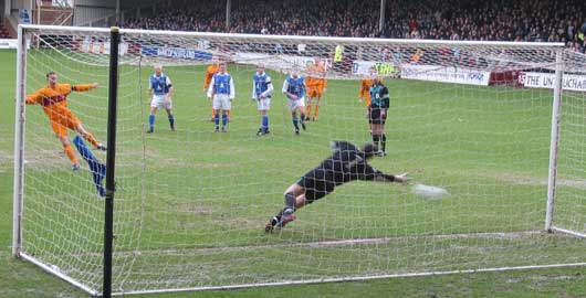 To the game then and John Connolly sprung a surprise before kick off, leaving out Alex Burke and opting to move Gary Wood back up front alongside O'Connor with Brian Reid back from injury to partner Aitken. Stephen Payne made his first start also on the right with Paul Burns switching wings to the left to accommodate him. Brian McColligan and Paul McMullan had to make do with seats on the bench alongside Burke, Jaconelli and Stuart Robertson. Before kick off there was a minute's silence perfectly observed in memory of former Scotland manager Ally McLeod who sadly passed away last week. "Super Ally" had been a former manager to both sides. There was a fair bit of snow around at this point but it pretty much stopped before play started. When the game did eventually get underway, it was a whirlwind start from the home team and they were awarded a penalty after precisely 1 minute and 18 seconds! The initial danger seemed to have gone as Bowey broke up the opening attack but his pass played Eric Paton into trouble and, closed down by two opponents, he lost possession and Clarkson (I think!) was able to break into the penalty area. Andy Aitken came across to challenge but was adjudged to have fouled the youngster by Mike McCurry who had little hesitation in awarding the spot kick. Up stepped Derek Adams to send the ball into the bottom left corner beyond Dodds' dive and give his side the earliest of leads. |