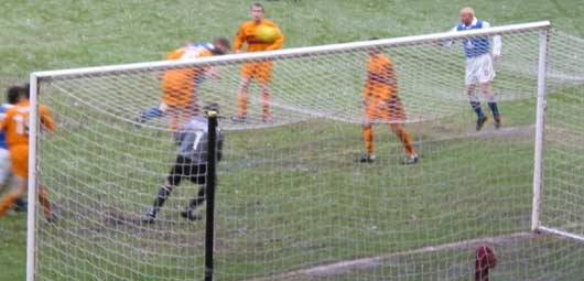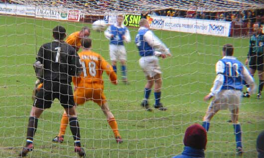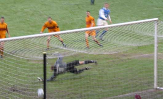 However, before Queens could take any heart from that they suddenly found themselves two down a minute later. This time the trouble came from a left sided corner kick. No-one picked up Alex Burns and "Toastie" was left with a free header from six yards to double the advantage. Six minutes later Gary Wood picked up his by now customary booking (he starts a two match League suspension from today) for a foul on halfway, though I thought his opponent made a meal of it somewhat. Just after the half hour mark Brian Reid deflected a shot wide and, from the resulting corner, David Bagan this time blocked another goalbound effort. The odd thing at this point was in the middle third of the park Motherwell were doing no more than Queens were and there seemed to be little between the sides, whereas for me Hibernian dominated us completely until late on in that game. However, Motherwell were far more dangerous around the opposition box than we were and that was the difference between the sides in the opening period. Indicative of this was the incident when Wood won possession and suddenly found himself and O'Connor in a two on two position with the Motherwell centre halves with Bowey running to join them quickly. However, O'Connor's pass pushed Wood too wide and then Wood rather than pick out Bowey on the penalty spot chose to shoot (or was it a cross?) from an acute angle and Marshall was easily able to deal with it.