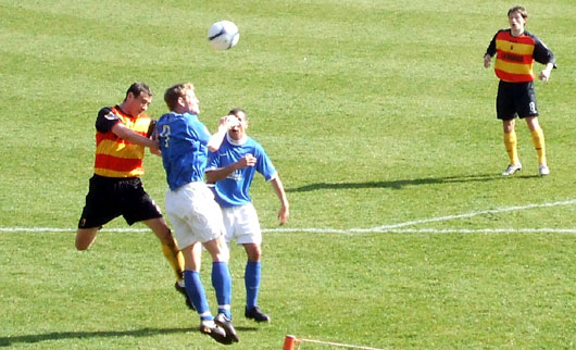 The game had a scrappy start with neither team getting their passing right early on. Queens were first to show willing though when, after eight minutes, Eric Paton got behind the full back to put in a fine cross which was volleyed narrowly past at the back post by Stevie Murray. A minute later though Adam Strachan blew Paton away in a sprint down the left and crossed low across the face of goal. The ball was picked up eventually by Mark Roberts who curled an effort wide of the far post. The closest chance of the opening period arrived in 13 minutes when a long clearance was headed on by O'Connor and sat up perfectly for Dobbie to half-volley from the edge of the penalty area wide right. The shot beat Tuffey easily but narrowly missed the left post. A few moments later Jimmy Gibson caused chaos in the Queens back line with a dangerous free kick but the same player found himself in the book soon after for a bad foul on Scally as he tried to bring the ball clear out of defence. |