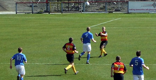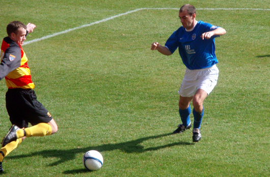 About half an hour in it became clear that Steve Tosh was struggling with his knee again and, though he soldiered on for ten minutes he was eventually relieved by John O'Neill. Andy Barrowman had been playing in central midfield whilst Tosh was struggling but reverted back to the right on O'Neill's introduction. Before the interval Stevie Murray tried his luck from long range but failed to trouble Tuffey and then Lauchlan made a goal saving challenge at the other end.
