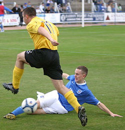 He did get 80 minutes but following a tackle in the box, late in the game, he felt that knee going again. Said an exasperated Neil, "I might just have come back that wee bit early and aggravated it, but I was desperate to get a game. I only hope it's not knocked me back too much! I was in getting treatment this morning while the other lads were training but the funny thing is, I've never been bothered by muscle injuries ever before". Asked if he's now 'kissed and made up' with Stevie Tosh after the unsavoury incident up at Airdrie last season Neil laughed and quipped, "I wouldn't go as far as kissing him but there's no hard feelings between Stevie and myself. However, when I first arrived at Palmerston he was picking his side for a training match and it just happened that I was his 'first choice'. I wonder why? I guess he thought it was safer to be on my side. "Seriously though, I'd never go out to intentionally injure a fellow professional. The tackle wasn't as bad as it looked. It was my trailing leg that caught 'Tosher' and video evidence later proved that and my 'red card' was then rescinded". Bill Goldie |