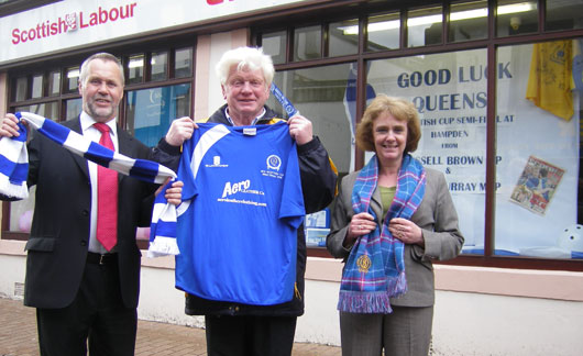![]() Russell Brown and Elaine Murray with Queens Chairman Davie Rae outside Russell and Elaine's office window display. |