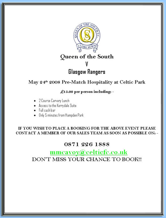 Prices will be: South Stand £35 East Stand £28 Family Section in the East Stand Adults £24 Children £10 (maximum of 4 per adult). Tickets will go on sale as follows: Season Ticket Holders and Shareholders: Saturday 10 May 2008 from 10 a.m. to 6 p.m. Voucher Holders, Season Ticket Holders and Shareholders Sunday 11 May from 10 a.m. to 6 p.m. Semi Final Ticket Holders Monday 12 May 2008 from 10a.m. to 6 p.m. Semi Final Ticket Holders and Accredited Coaches Tuesday 13 May 2008 10 a.m. to 7 p.m. General Sale Wednesday 14 May from 10 a.m. to 6 p.m. And then until tickets are sold from 10 a.m. to 6 p.m. daily Tickets may be purchased from the Club Office at Palmerston in person, by post with a cheque or by telephone with use of credit/debit card. There will be a £1 per ticket charge for persons using a credit/debit card. Tickets ordered by post or telephone will be posted out by first class post at the purchaser's risk. No refunds or replacements will be given for missing tickets. There is also the option of 'Guaranteed Next Day Delivery' at a cost of £5. A signature is required on delivery. Any person who has organised a coach to the game and has not yet done so should contact the Club Office asap to register details of their coach and become an accredited coach (organiser, operator, size etc). Organisers' of coaches should collect names and addresses of passengers along with their ticket requirements and place an order before Sunday 11th May. Tickets will be available for collection on exchange for payment from the Club Office on Tuesday 13th May 2008 between 10 a.m. and 7 p.m. Sale of Tickets will be limited to: Season Ticket Holders and Shareholders - 5 Voucher Holders - 2 Semi Final Ticket Holders - 1 TICKETS WILL NOT BE SOLD AT PALMERSTON TO SUPPORTERS OF RANGERS FOOTBALL CLUB. ANY PERSON ENTERING THE QUEEN OF THE SOUTH SECTION AT HAMPDEN PARK WHO IS A RANGERS' SUPPORTER MAY BE EJECTED FROM THE STADIUM. Eric Moffat Club Secretary |