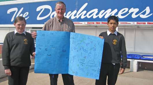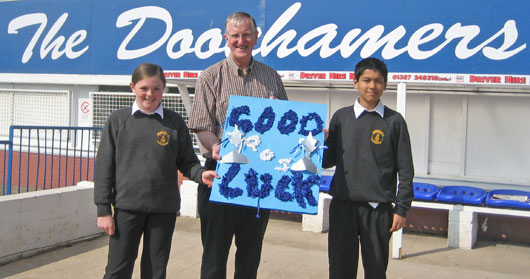 ![]() ![]() Daryl Finlay (11) and Habib Ullah (11) from Laurieknowe Primary School visited Palmerston today and presented a Good Luck card to the Club Secretary, Eric Moffat. Over 300 pupils in the school had signed the card wishing the team all the best for the Scottish Cup Final. |