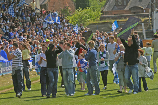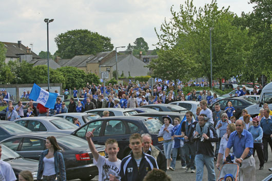 Last night the players and club officials celebrated the achievement at the Cairndale Hotel with their wives and families and this afternoon the townsfolk turned out in great numbers to welcome their heroes home. Thousands lined the streets of Dumfries as the open-top bus with the players aboard made its way from DG1 to Palmerston where the 'second biggest' crown of the season, around 5000, packed the ground and cheered each and every one of them as they were announced onto the park. Manager, Gordon Chisholm, couldn't believe the tremendous welcome and said, "It was like we'd actually won the Cup. I don't know what it would have been like if we had". One stelwart Queens' man (close to tears) remarked, "Today's been the best day of my whole life". Bill Goldie ![]() A sea of blue follows the team bus down Buccleuch Street ![]() Chis gives the fans a wave ![]() Crowds swarmed to Palmerston ![]() The man himself Davie Rae ![]() The crowd show their appreciation ![]() Big Jim takes the applause |