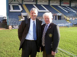 Lunch was taken at a hotel in Broughty Ferry and the buffet comprised foods requested by Queens. Carbohydrate (for fuel) was high on the list and pasta, beans, toast, and crunchy nut corn flakes were on offer. Protein (to build and repair muscles) was present in the scrambled egg, fish, and chicken. The meal was completed with vanilla ice cream and jaffa cakes! Then it was off to the ground. Dens offers a stark contrast to those cloned modern stadia that look more like supermarkets than football parks. The oak lined board room was adorned with memorabilia covering 100 years of history for Dundee F.C. Amid the silver ware the walls were adorned with images of dark blue legends such as Charlie Cooke, Ian Ure and Alan Gilzean. At 2.30 the teams were announced. We often hear stories of clubs where the board influence team selection but this is not true of Queens where copies of the team sheet were eagerly snapped up and scrutinised by our board members. Sandwiches were also snapped up (by me)….well it would have been rude not to. I felt similarly constrained when the pies and Forfar bridies were brought out at half time (along with more sandwiches) and at full time when sandwiches and cakes were placed on the table. I hope I don’t appear greedy and state in my defence that I sent a text home to cancel my dinner! The journey home was a subdued one. Everyone was very flat and since the DVD of bare knuckle fights and shotguns failed to lift the spirits, I wished I had brought along my copy of ‘Shrek’. I enjoyed my day and feel that I gained a very interesting glimpse behind the scenes. The professionalism of the manager, staff and players is impressive as is the commitment and resolve of the board. The Chairman’s attitude was demonstrated in one amusing episode. A party member drew the attention of the board to the pessimistic comments about Queens made by Des McKeown in his column in the ‘Sun’ newspaper. Being also a friend of the columnist, this party member quickly put a call through to Des to wind him up. The phone was then passed to David Rae who engaged in a bit of banter with the former Queens player in which he politely reminded him that Queens have been in worse positions and pulled through. With the determined attitude displayed by all on Saturday, who will doubt that we won’t do so again. Written by Jim Harkness Bill Goldie |