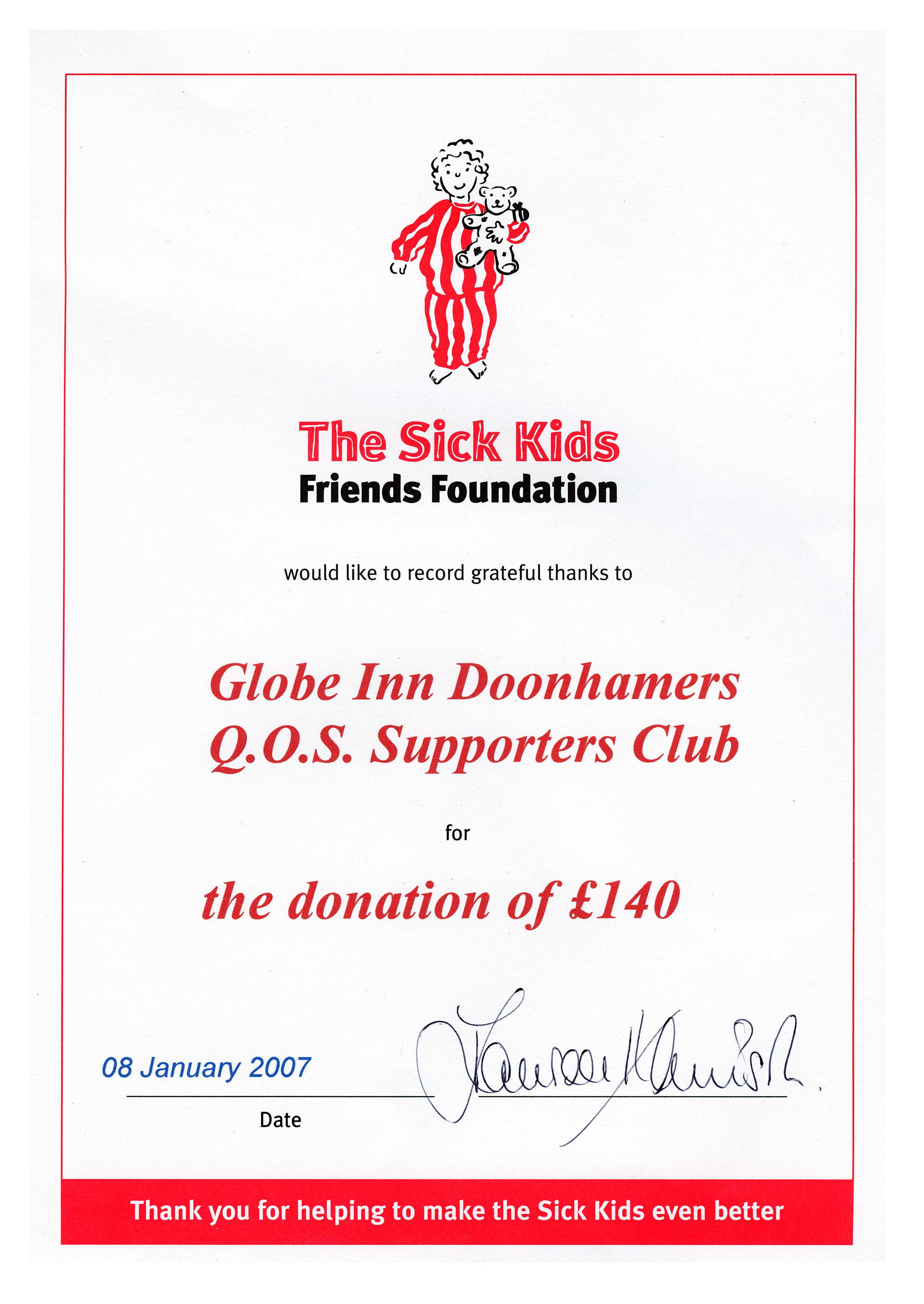 The committee of the Globe Inn Doonhamers would like to thank all those Queens' fans who purchased one of the calendars and help make it a 'sell out'. Many generously gave more than the asking price which resulted in a £140 cheque being sent to the Sick Kids Friends Foundation. Well done--especially to our programme editor. Bruce Wright who was the brainchild behind this excellent and professional production.