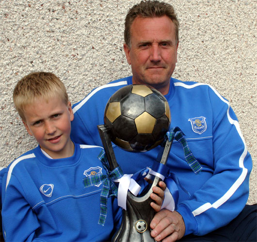 ![]() Midfielder Nathan Hutton proudly shows the Under 13's winners trophy with coach Dave Hutton(right). |