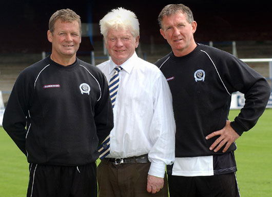 We've seen a lot of change in managers in our division over those past couple of months--in fact it's been somewhat of a managerial merry-go-round! Colin Hendry has replaced Joe Miller at Clyde, Mark Procter has taken over from John Robertson at Livingston, Ian McCall has filled the vacancy left by Dick Campbell at Firhill and Gordon Chisholm is now our new boss. Of last season's First Division sides only the second, third and fourth placed clubs, St Johnstone, Dundee and Hamilton remain unchanged. With Gretna promoted and and Airdrie and Ross County relegated we have Dunfermline, Morton and Stirling Albion joining Division One and I honestly believe it will be harder than ever this coming season. To date we've only signed one new player, Neil MacFarlane, and managed to get Jamie Adams back on loan to the New Year and that really pleased me as Jamie was such a big influence when he joined us from Kilmarnock last season. I'd also like to get Jamie MacDonald back on loan from Hearts! He too was suberb when he was with us and I know he'd love to come back but things are undecided at Tynecastle at present so we'll have to be patient. Ideally we need about five more players, and that includes two keepers. But we're not going to rush in too quickly for the manager has stressed that it's quality he's after not quantity. Just look at last season! No fewer than eight new faces were signed early on (and that's not including on-loan players) but only Neil Scally and Jim Lauchlan were still actively involved by the end of January. I don't want a repeat of that! The players report back for pre-season training a week on Friday, so it's not long now. Season tickets will go on sale on Monday morning at 10.00 am. If you are a Senior Citizen or a Junior Blue there's no change in the price, but there's a slight increase of £10.00 for others. However, if you purchase them before the end of June you'll still get them at last season's price. On Saturday I was again invited to join the dignatories for the Guid Nychburris celebrations and, on hindsight, sorry about my black and white unbrella. It was a pity the rain marred it to some extent--particularly the parade in the evening. I thought that our main entry in the parade was great and, personally, I felt it deserved better than third place. It was a real masterpiece and it never ceases to amaze me all the hard work put in by the Action Group to make this possible. Once again, my grateful thanks to everyone concerned. David Rae Bill Goldie |