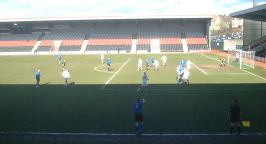 In 76 minutes another McStay free kick caused chaos in the home penalty area and, from Lovell's flick on, Gary Wood so nearly forced the ball home. Three minutes later Sandy Stewart made a double change with Fraser Coyle and Stephen Docherty replacing Graeme Holmes and Gary Twigg. On 75 minutes Stuart Lovell picked up the first booking of the game for a cynical foul on McDougall. A minute later Andy Thomson was denied a goal on the turn from a corner kick by a goal-line clearance. On 86 minutes Jim Thomson joined Lovell in the book for a barge through the back of Prunty and in the final minute so did David Dunn for a trip from behind on McStay.
