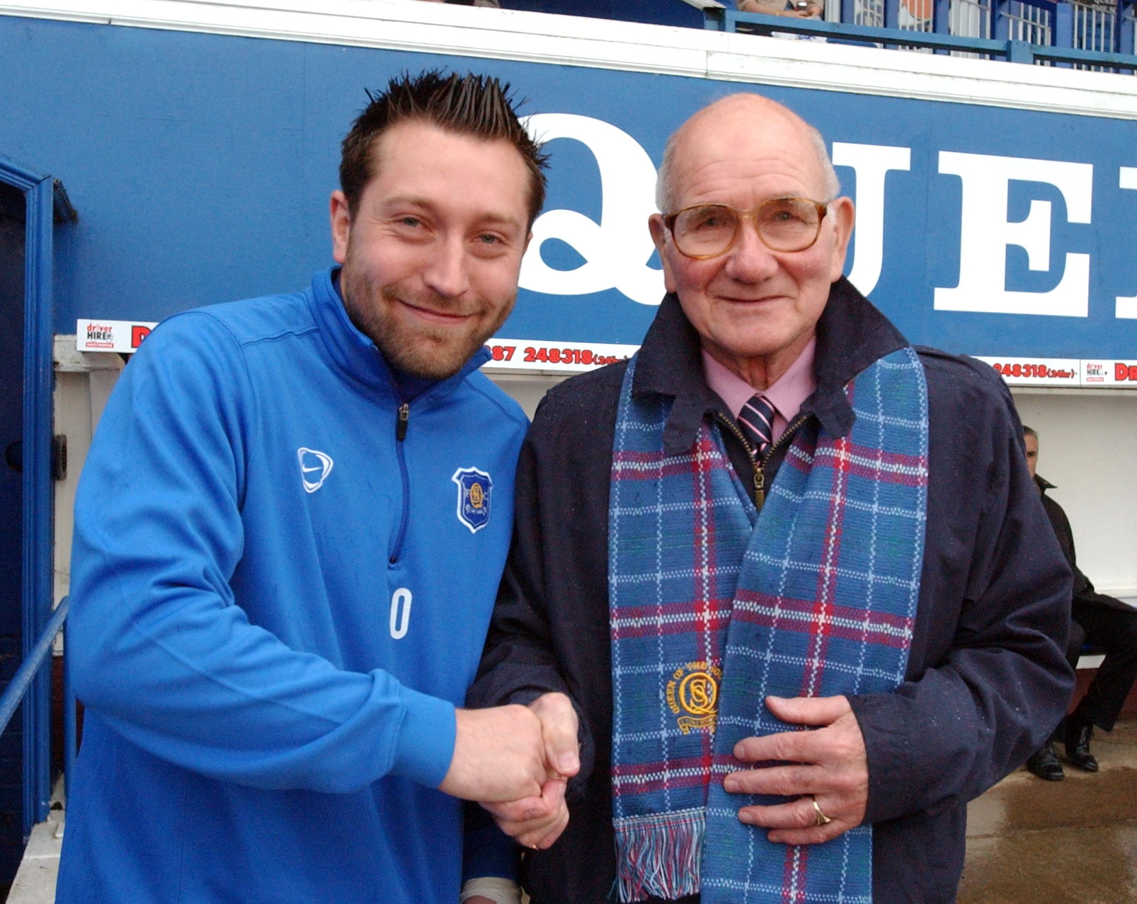 Two of the most prolific strikers Queen of the South have ever known met up at Palmerston on Saturday. Jim Patterson, a 'legend in his time', came face-to-face with our present top markman, Stephen Dobbie. To date 'Dobbs' has netted 31 goals since joining Queens last January but has a long way to go to catch up with 'Big Jim'. Jim hailed from Luncarty, Perthshire and signed for Queens as a 19-year-old in 1949. He was 14 years at Palmerston and became a huge favourite with the home fans. He boasts an unbelievable goal-scoring record! In 462 appearances he scored no fewer than 251 times with 11 hat-tricks to add to his credit. That's an average which takes some beating.