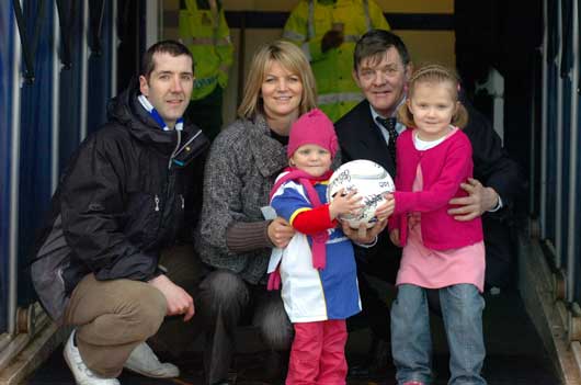 Mark Armstrong has been in touch to advise that the bucket collection held at the Dundee game was a huge success, with £2981 being raised on the day. The sum included a generous donation from the victorious Queens squad as well as from Mr Conchie, the winner of the half-time draw, who very kindly donated half of his winnings to the appeal. Also, the badge sold by the Globe Inn Doonhamers was a tremendous success and actually sold out twice. Mark also advises that the signed Queens top [organised by John Kerr] and the signed Livingston Match-ball [donated by George 'Chopper' Dickson] are available to the highest bidder. If you would like to bid for one - or both - of these items, please email Mark at esther@marmstrong.fsnet.co.uk The closing date for bids is 17th May. ![]() Chopper Dickson and granddaughter Rachel present the Livingston Match-ball to the Armstrong family. |