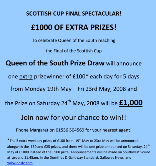 Prices will be: South Stand £35 East Stand £28 Family Section in the East Stand Adults £24 Children £10 (maximum of 4 per adult). Tickets will go on sale as follows: Season Ticket Holders and Shareholders: Saturday 10 May 2008 from 10 a.m. to 6 p.m. Voucher Holders, Season Ticket Holders and Shareholders Sunday 11 May from 10 a.m. to 6 p.m. Semi Final Ticket Holders Monday 12 May 2008 from 10a.m. to 6 p.m. Semi Final Ticket Holders and Accredited Coaches Tuesday 13 May 2008 10 a.m. to 7 p.m. General Sale Wednesday 14 May from 10 a.m. to 6 p.m. And then until tickets are sold from 10 a.m. to 6 p.m. daily Tickets may be purchased from the Club Office at Palmerston in person, by post with a cheque or by telephone with use of credit/debit card. There will be a £1 per ticket charge for persons using a credit/debit card. Tickets ordered by post or telephone will be posted out by first class post at the purchaser's risk. No refunds or replacements will be given for missing tickets. There is also the option of 'Guaranteed Next Day Delivery' at a cost of £5. A signature is required on delivery. Any person who has organised a coach to the game and has not yet done so should contact the Club Office asap to register details of their coach and become an accredited coach (organiser, operator, size etc). Organisers' of coaches should collect names and addresses of passengers along with their ticket requirements and place an order before Sunday 11th May. Tickets will be available for collection on exchange for payment from the Club Office on Tuesday 13th May 2008 between 10 a.m. and 7 p.m. Sale of Tickets will be limited to: Season Ticket Holders and Shareholders - 5 Voucher Holders - 2 Semi Final Ticket Holders - 1 TICKETS WILL NOT BE SOLD AT PALMERSTON TO SUPPORTERS OF RANGERS FOOTBALL CLUB. ANY PERSON ENTERING THE QUEEN OF THE SOUTH SECTION AT HAMPDEN PARK WHO IS A RANGERS' SUPPORTER MAY BE EJECTED FROM THE STADIUM. Eric Moffat Club Secretary |