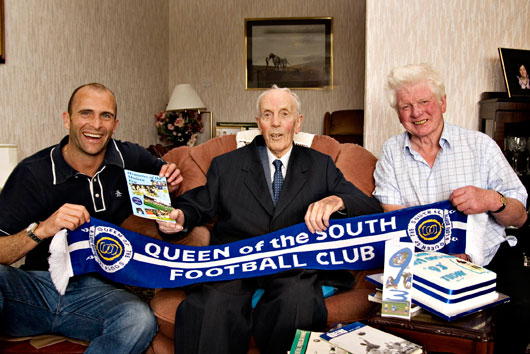Alas, Andy died only last week which put paid to any reunion but being a retired farmer Sam had known David Rae for many years and when the Chairman himself popped in to say 'many happy returns' and present him with a Queens' scarf, the two of them had a right good 'chin-wag' and discussed our chances of beating Rangers in the final. Club captain, Jim Thomson, also looked in on his way home from training and handed over a Queens' book. In his younger days Sam farmed at Low Lann, Tynron, near Moniaive but retired 28 years ago to settle at his present abode on the outskirts of the town. Last season was the first he'd missed for 80 years and only because the doctor forbade him from attending owing to his troublesome knees. But the old campaigner insists, "I've been a season ticket holder at Palmerston for about 50 years so I'm hoping to be back again next season". And, with a wry smile asked the Chairman to reserve his 'old seat' for him saying, "I haven't given up yet. My father attended games at Palmerston until he was 92 and I'm proud to say that I've now bettered his record". Sam has many memories of days gone by and recalls, "My first ever visit was as a 13-year-old to watch them play Nithsdale Wanderers. I soon became a 'regular' and stood in 'Jim Jolly's Coo Shed'--the old covered enclosure. There are so many games I still remember like our first ever match in Division One when we beat the mighty Glasgow Celtic. McStay and their big centre-forward McGrory were playing but we won 3-2 with Bell (2) and McGowan scoring". Another famous victory that springs to mind was the day in January, 1937 when Queens knocked Rangers out of the Scottish Cup. Interrupted our host in anticipation, "Yes, I remember that one too!. And it was in the First Round. Laurie Cumming put a nice pass through to John Renwick who lobbed the ball over goalkeeper Jerry Dawson's head and into the net and we won 1-0". One of his heros back then was 'penalty king', Joe Tulip and Sam claims he can never recall him ever missing from the spot. Our previous sojurn in the Scottish Cup semi-finals against Rangers was another he was keen to talk about and Sam stressed, "I was there as well along with thousands of others who travelled up by train, bus or a car--if they were lucky enough to have one. Jackie Brown scored for us in the first half but late in the game there was a mix-up between our keeper, Roy Henderson and Dougie Sharpe and Rutherford's corner kick finished up in the net". And yet another he remembers was the day Queens came back from 3-1 down to beat Hearts 4-3 with a late goal from Wattie Rothera. But Sam admits that the recent cup win over Aberdeen beats them all. "I have lots of happy memories of Queen of the South" he concluded. "And I'll support them until the day I die!. But that cup-tie against Aberdeen just about gave me heart failure as goals were flying in from everywhere. I had five friends in to watch it on the TV and they all enjoyed it so much I'll probably have them back knocking at my door for Rangers in the Final. They're not unbeatable and I think we've got a good chance. It's only 11 against 11. "To even reach the Scottish Cup Final is an achievement and is great for the town of Dumfries and the publicity it has brought has certainly 'put us on the map'. My nurse has never been to a football match in her life and she's going. I've been at Hampden for a Scotland v England international with 150,000 there, and still remember what it feels like. They'll be nothing like that on the 24th of April but they'll be over 50,000 and I only wish I could have been one of them. But you never know. "This season is as good as any I remember. Well done to all concerned and all I can say is good luck!"